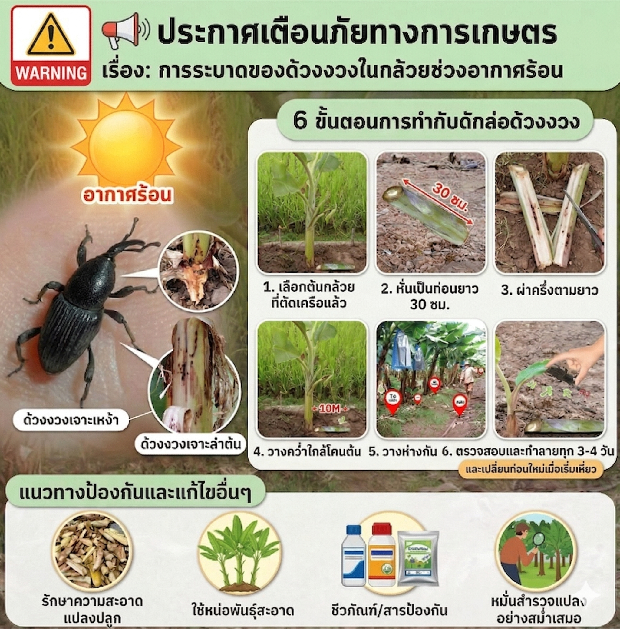 เนื่องจากในช่วงนี้สภาพอากาศร้อน ส่งผลให้เกิดการระบาดของศัตรูพืชในแปลงปลูกกล้วย โดยเฉพาะ “ด้วงงวง” ซึ่งเป็นแมลงศัตรูสำคัญที่ทำลายต้นกล้วยอย่างรุนแรง เกษตรกรผู้ปลูกกล้วยควรเฝ้าระวังอย่างใกล้ชิด