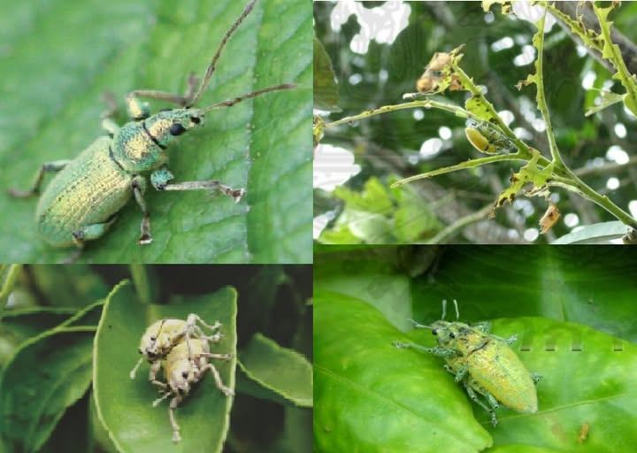สภาพอากาศในช่วงนี้อากาศร้อนชื้น เตือนผู้ปลูกพืชตระกูลส้ม (เช่น มะนาว มะกรูด ส้มโอ และส้มเขียวหวาน) ในระยะ แตกใบอ่อน รับมือแมลงค่อมทอง กัดกินใบอ่อนและยอดอ่อนหากทำลายมากจะกินใบอ่อนจนเหลือแต่ก้านใบแนวทางป้องกัน1. เขย่าต้นหรือกิ่งและเก็บตัวแมลงไปทำลาย