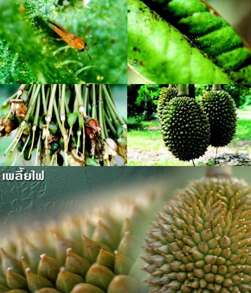 สภาพอากาศในช่วงนี้อากาศร้อน มีฝนตก และฝนตกหนักบางพื้นที่ (ภาคใต้) เตือนผู้ปลูกทุเรียน ในระยะ พัฒนาผล เตรียมต้น (ระยะการเจริญทางใบ) รับมือเพลี้ยไฟพริกทั้งตัวอ่อนและตัวเต็มวัยใช้ปากเขี่ยและดูดกินน้ำเลี้ยงส่วนอ่อนต่าง ๆ ของพืช มีผลทำให้ใบอ่อนหรือยอดอ่อนชะงักการเจริญเติบโต แคระแกร็น ใบโค้ง แห้งหงิกงอ และไหม้ การทำลายในช่วงดอก ทำให้ดอกแห้ง ดอกและก้านดอกเปลี่ยนเป็นสีน้ำตาลแคระแกร็น และร่วงได้ และในช่วงผลอ่อน ทำให้ชะงักการเจริญเติบโต หนามเป็นแผลและเกิดอาการปลายหนามแห้ง ผลไม่สมบูรณ์และแคระแกร็น เพลี้ยไฟจะระบาดรุนแรงในช่วงแล้ง ระหว่างเดือนธันวาคม – พฤษภาคม ซึ่งตรงกับระยะที่ต้นทุเรียนออกดอกติดผล เพลี้ยไฟมีอาหารอย่างอุดมสมบูรณ์ สามารถเพิ่มปริมาณได้มากแนวทางป้องกัน1. สำรวจการระบาดของเพลี้ยไฟในระยะแตกใบอ่อน ดอก และผลอ่อน หากพบเพลี้ยไฟระบาดเล็กน้อยให้ตัดส่วนที่ถูกทำลายทิ้ง