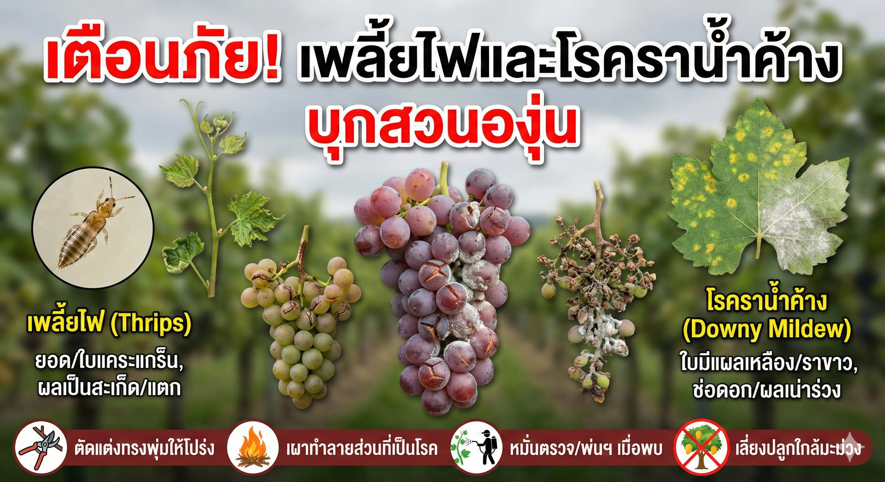อ่านต่อ - ⚠️ เตือนเกษตรกรสวนองุ่น ระวัง “เพลี้ยไฟ–โรคราน้ำค้าง” ระบาดช่วงอากาศชื้นสลับร้อน