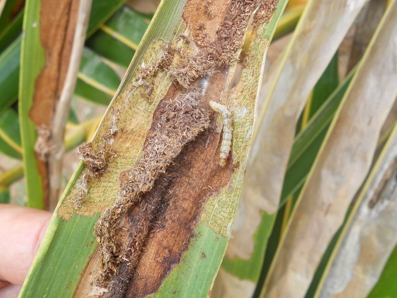 - ยอดแห้งตาย หนอนเจาะโคนหรือยอดเข้าไปกัดกินจุดเจริญเติบโต