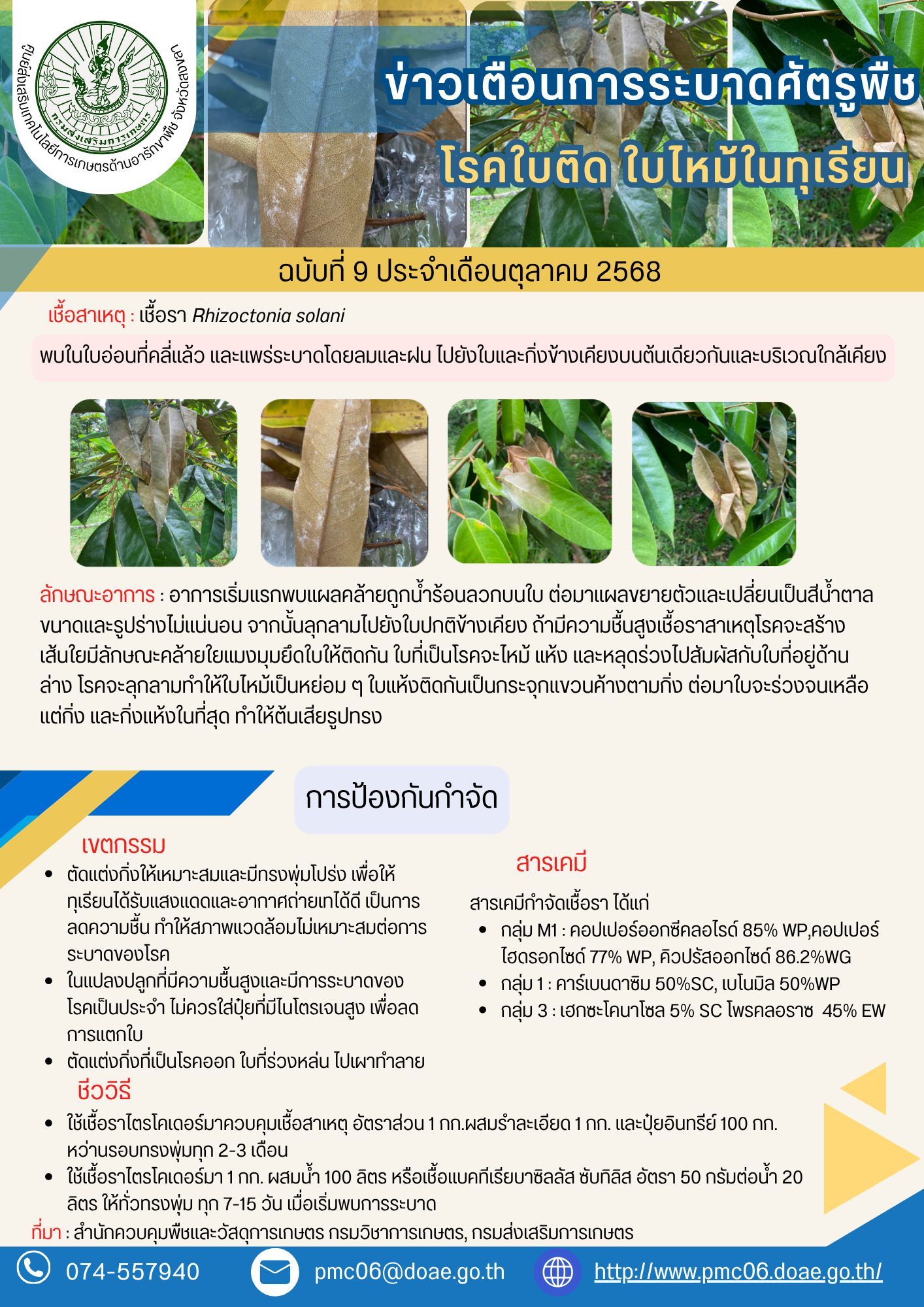 แจ้งเตือนเกษตรกรผู้ปลูกทุเรียน เฝ้าระวังการระบาดของโรคใบติด หรือโรคใบไหม้ ที่เกิดจากเชื้อรา Rhizoctonia solani ซึ่งมักพบในใบอ่อนที่คลี่แล้ว และแพร่กระจายอย่างรวดเร็วโดยลมและฝนในช่วงที่มีความชื้นสูง