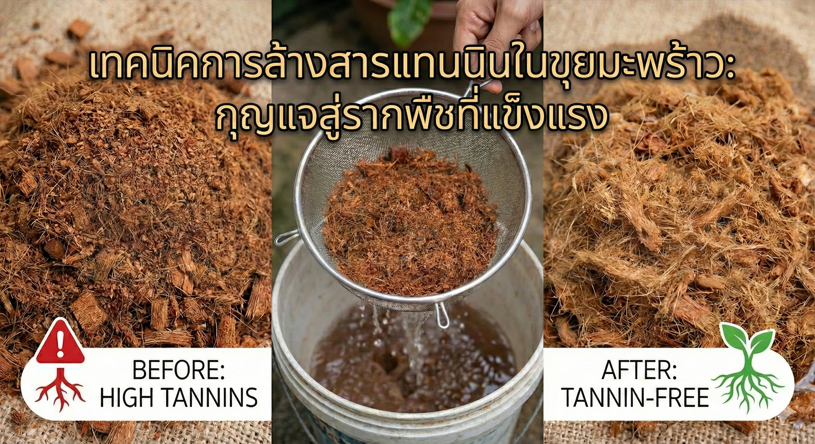 การล้างสารแทนนินและการปรับสภาพขุยมะพร้าวด้วยอัตราที่เหมาะสม เป็นขั้นตอนสำคัญตามหลักวิทยาศาสตร์เกษตร ช่วยลดสารยับยั้งการเจริญเติบโต ปรับสมดุลเคมีของวัสดุปลูก และส่งเสริมการพัฒนาระบบรากอย่างมีประสิทธิภาพ ส่งผลให้พืชเจริญเติบโตแข็งแรง ให้ผลผลิตดี และยั่งยืนในระยะยาว